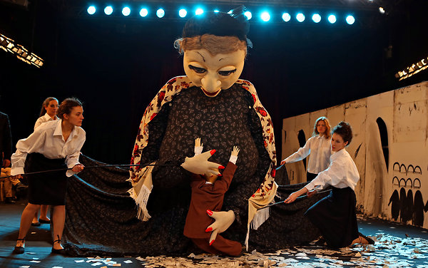 The second half – focused on Shostakovich – struggles to maintain the fluency of the first but makes up for it with two wonderful set pieces. The first is a huge puppet that acts as both ‘mother’ and ‘mother Russia’. It is a
