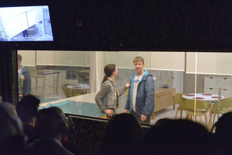 The play would not really work without Miriam Buether (and her teams) sensational redesign of the Almeida space. It no longer resembles a theatre but instead the hermetic sealed world of the TV studio. The audience watches behind two-way mirrors and listens through headphones to microphone links. We become the voyeurs sustaining the show and we are complicit in what we are watching. Indeed through Sacha Wares sympathetic direction we are given an explicit choice at one point to either watch Carly and Ashley have sex, or focus on a monitor trained on a security guard who turns his back on the action.