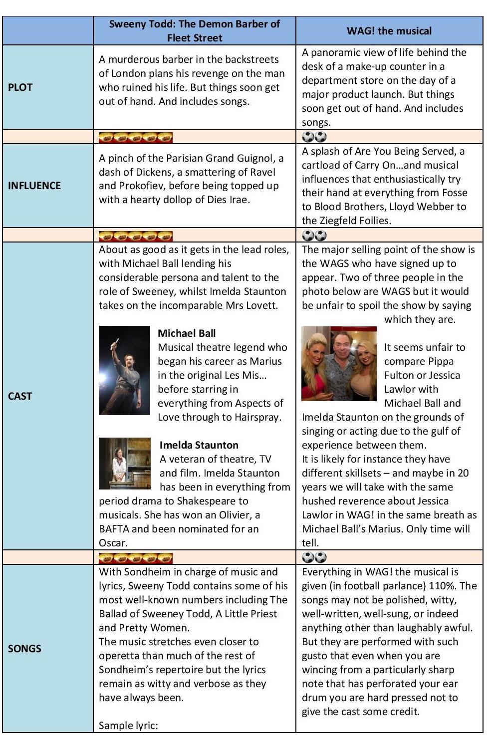 In the interests of fairness, Civilian Theatre has assessed the merits of both shows to see whether Sweeney Todd: The Demon Barber of Fleet Street, the perennially popular Stephen Sondheim musical that won rave reviews at the Chichester Festival last year and has since transferred to the West End, is really any better than WAG! The Musical, which was enjoying its world premiere at the Ye Olde Rose and Crown in Walthamstow.