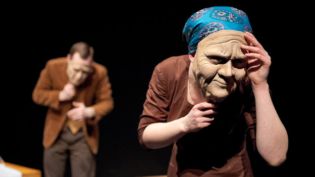George Mann and Deborah Pugh play the husband and wife, unmasked for flashbacks and masked as the older couple. By inhabiting both parts they imbue the pair with a wonderfully detailed chronology that is played out through repeated mannerisms that acts as visual motifs. Highly skillful physical actors they bring the masks alive with a striking expressive quality that constantly surprises in its ability to capture the full spectrum of the grieving process on an inanimate mask.