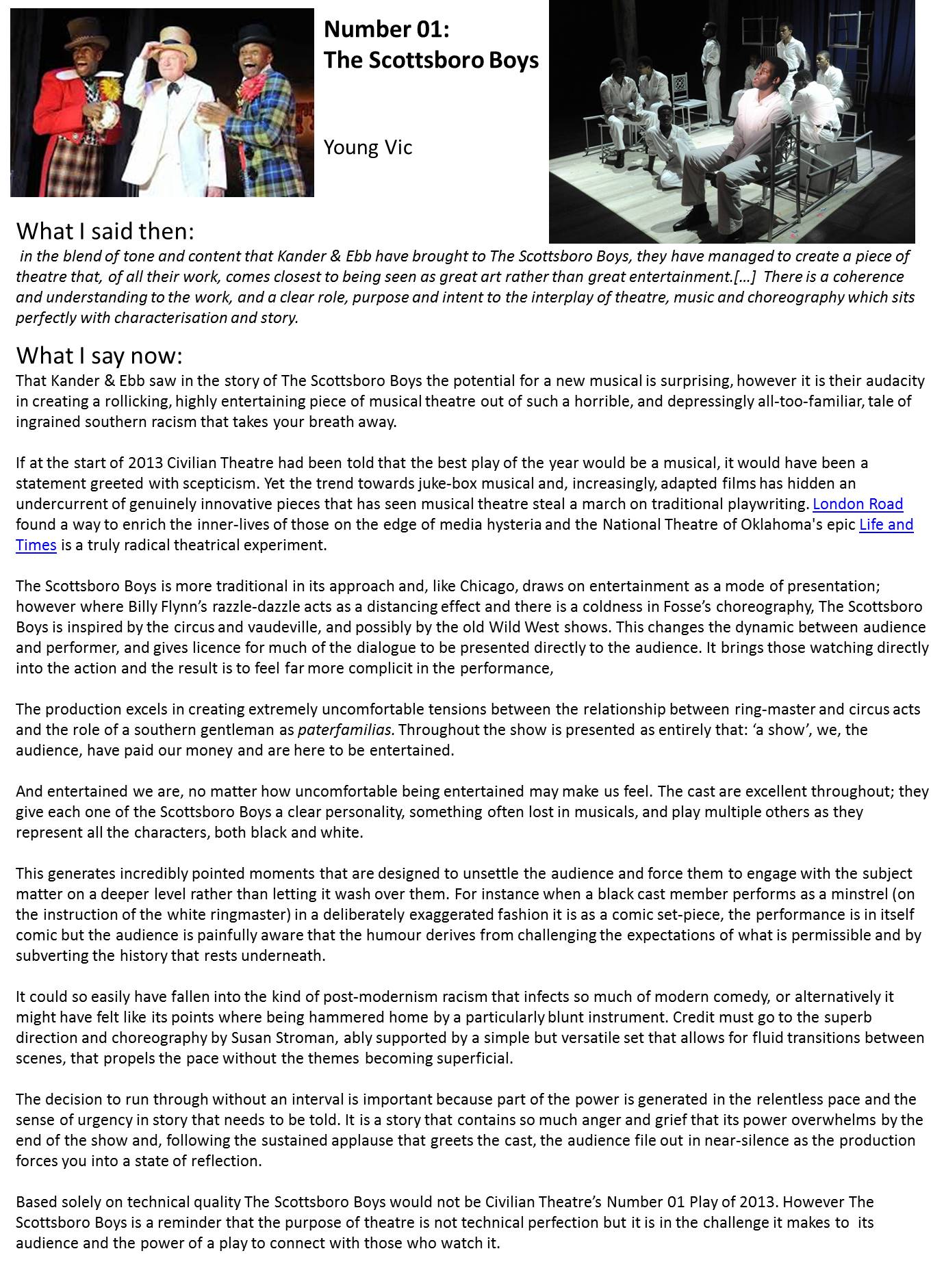 Over the last few days Civilian Theatre has been counting down their Top 10 plays of 2013. The decision making process to find a top 10 was difficult enough to begin with, and there were at least five or six plays that were edged out in the end. It was a surprise to discover that Coriolanus – thoroughly enjoyable – did not get close and even David Tennant in Richard II was edged out; a particularly hard call given it sees one of my favourite verse-speakers meet one of my favourite plays by Shakespeare. A mention should also go to Harriet Walter – superb in a brave all-female production of Julius Caesar and the best Brutus that I have seen on stage, but with enough overall flaws to edge it out of contention.