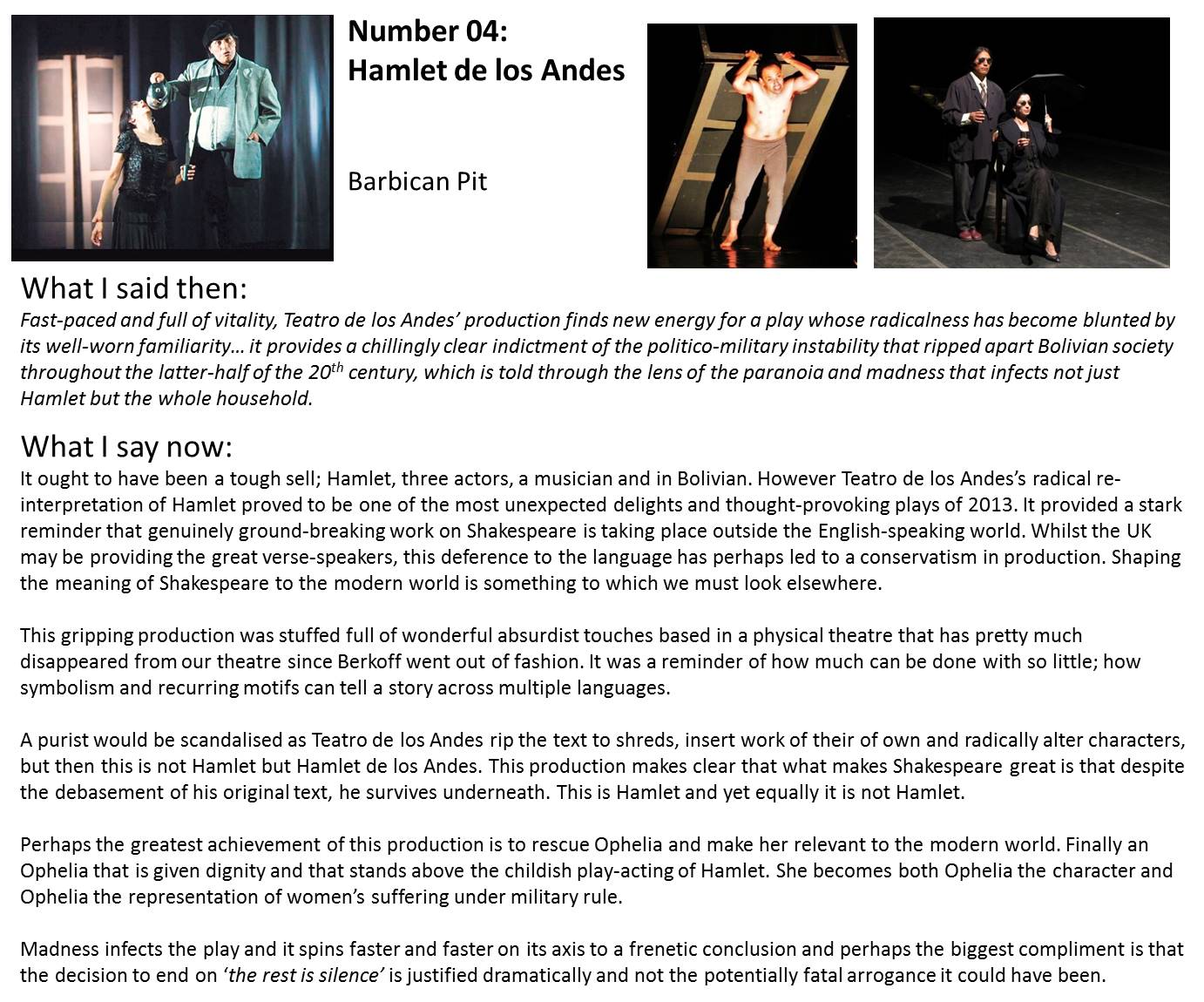 Three very different plays united in their complete unexpectedness. Between them they made three of the top four places in Civilian Theatre’s Top 10. It proved once again that you just need to scratch the surface to find innovative, powerful and challenging theatre. In the end Hamlet de los Andes edges it purely because nothing about it seemed promising. The Events had the weight of David Greig and The Scottsboro Boys had Kander & Ebb; Hamlet de los Andes was an unknown– in the UK – Bolivian company that had the audacity to rip apart Hamlet for their own ends. The result was brilliant.