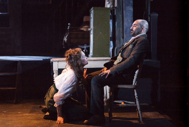 The real skill of Wilson’s performance is how she understands the limitations of O’Neil’s writing to a modern audience. She doesn’t try to force the language but instead inhabits the whole character; Wilson brings the part alive with a nervous tension that can be read through the way her hands struggle to knot the front of her apron or pick at the wood chipping off the kitchen table. The weight of the burden upon her can be felt through the way that the corner of her mouth begins to pull down as she lists her husband’s various failings, and in the rigidity of her body every time her husband makes noise offstage.